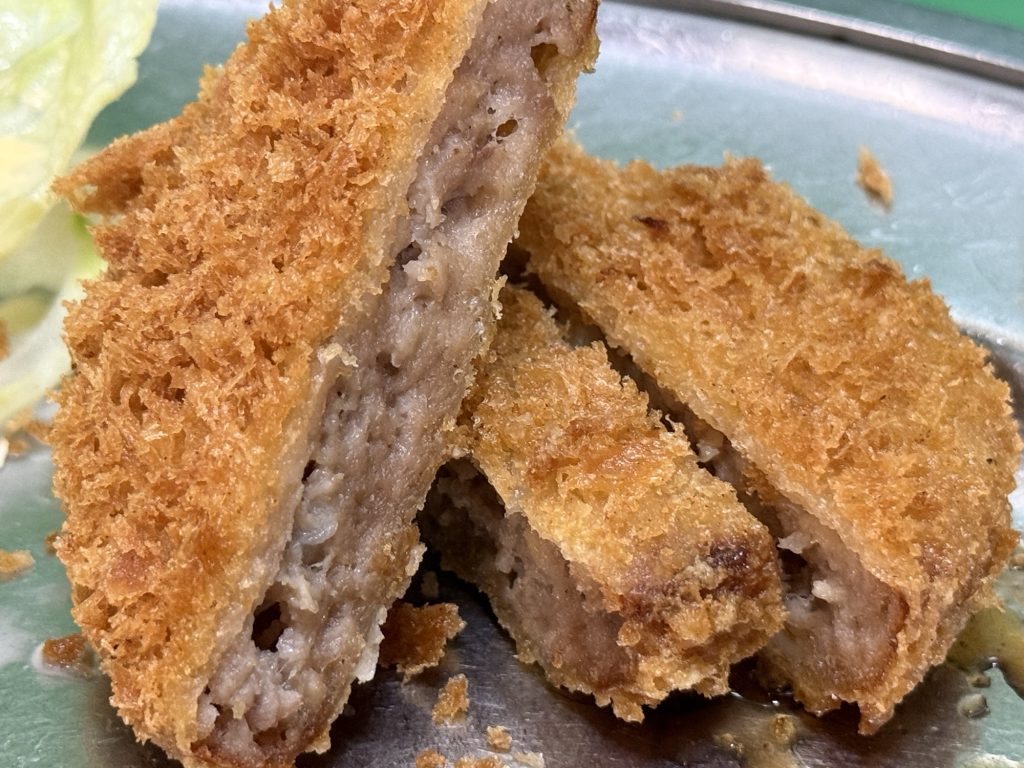 ミックスフライは、メンチカツ・ヒレカツ・クリームコロッケ。フライの衣がカリッと香ばしく、油もキレキレでいいですよ〜
