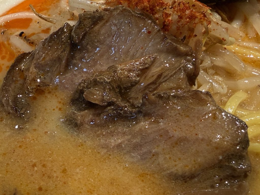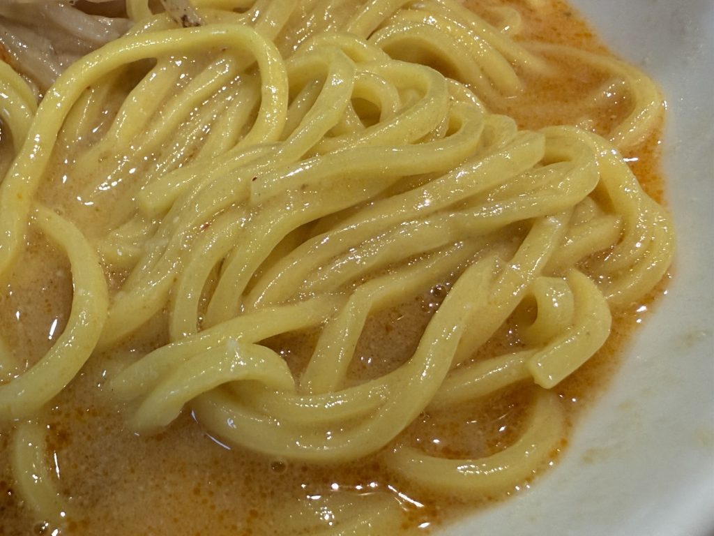 自家製の濃厚味噌。担々麺のようなとろとろ粘度のあるスープ、豚骨等をベースにコラーゲンもたっぷり。思っていたよりも塩味もきいているな。自家製ラー油でピリッとアクセントも。