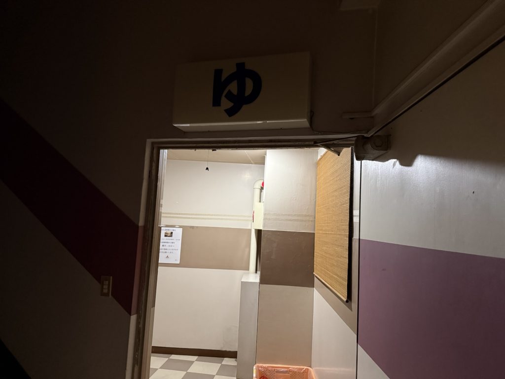 2階に上がり右手奥へと進んでいく。途中、照明を落としているので暗く、老朽化で雨漏りなど随所痛々しいことになっているが、その先に浴場がある。