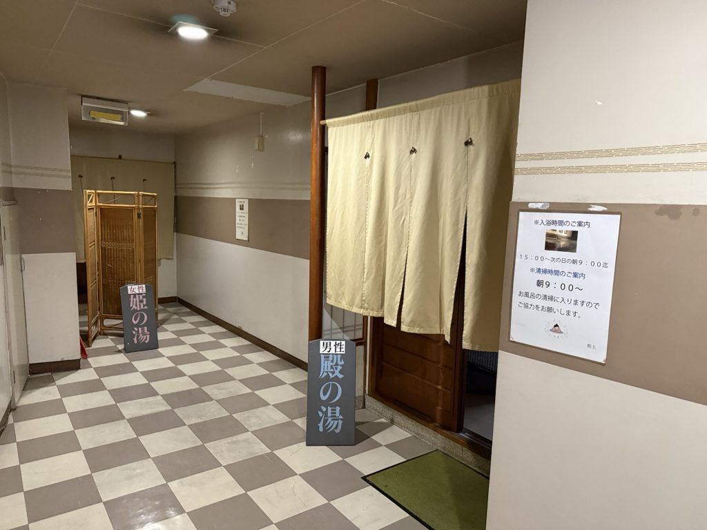 日帰り温泉は1000円(税込)。こちらのお宿、尾畑源泉からそのまま湯を引いている。源泉側の都合で直近、宿泊者みな断っていたとか。今日から営業しているというラッキーなタイミングに加え、設備の古さ、温泉の良さをご主人・おかみさんが丁寧に説明される。