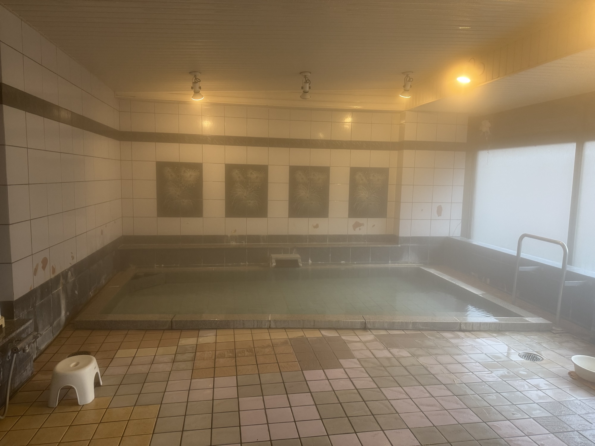 脱衣所にしても浴場にしても、確かに古い感じはするものの、きちんと手入れが行き届いてる。浴場は内湯が一つ。露天風呂もあるようだけど、今回はこの内湯のみで営業。