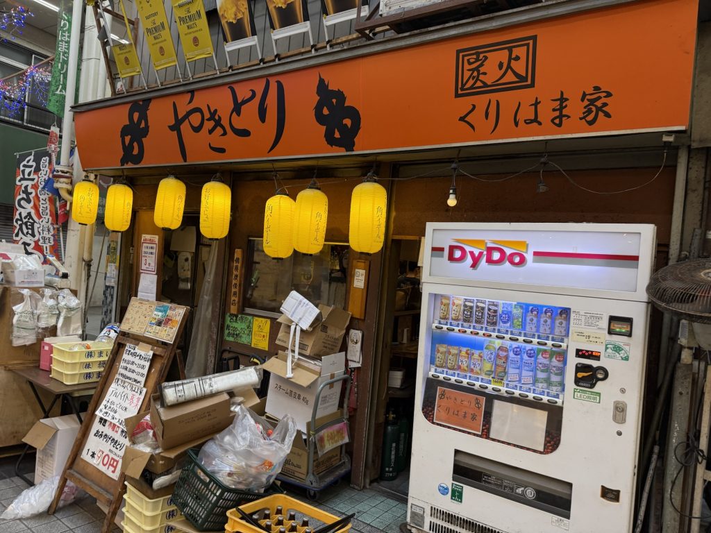久里浜商店街の一角、黒船仲通りを進むとやきとりのお店が。あ、店頭売りだけでなく立ち飲みもやってるー、ちょっと覗いてみようかな。お店の名前は、焼き鳥 くりはま家。