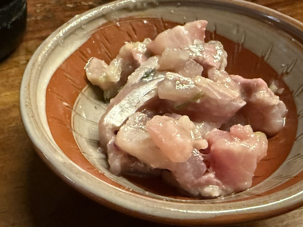 お店に入った時点で気になっていたので、まずは釣り鯵なめろう(300円税込)を発注(やきとりのお店なのに)。おー鯵、脂のって甘みもあるね。美味しいや。