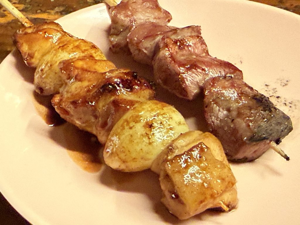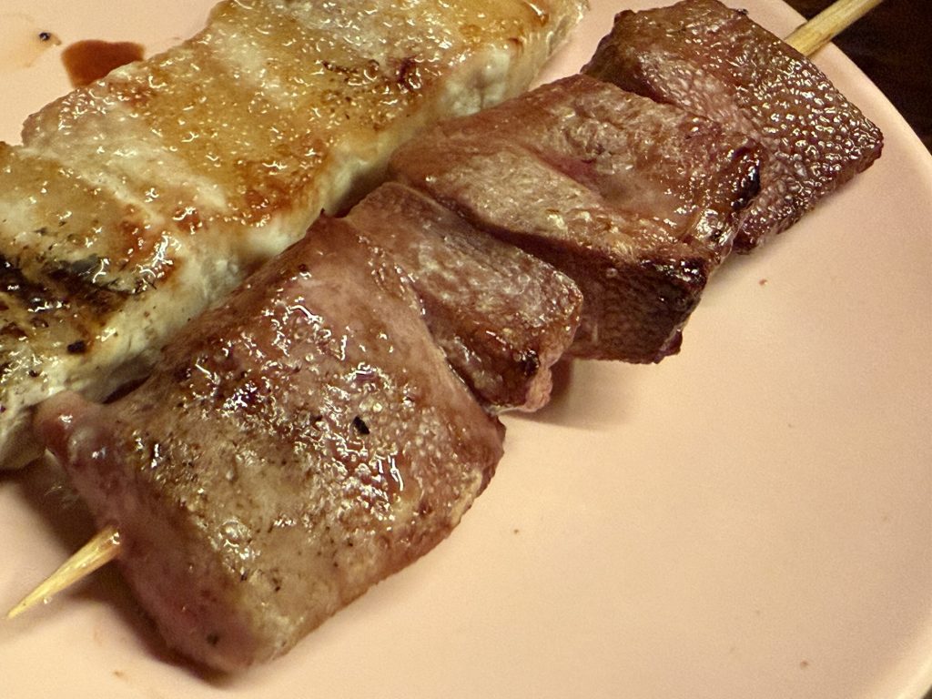 かしらはサクサクとした食感だな、脂っぽくなくてハツみたいだわ。ももにんにくは塩で、鶏もも肉がほあほあ、おーにんにくきくな~美味い。