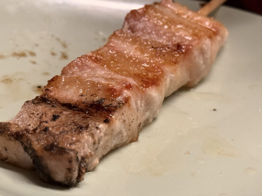 合鴨(140円税込)とねぎま(140円税込)。合鴨はつまみの一品でよく見かける合鴨ロースの形状。ハムみたいな質感&コクのある味わい、塩味が程よくて美味い。ねぎまも鶏身が柔らかくて、噛むほどに旨みが出てきますな。