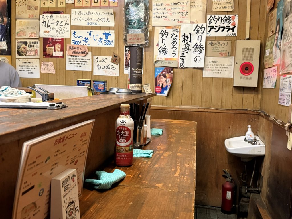 おー、激渋の茶色い空間がたまりませんな。板張り壁には至る所に品書き、L字の立ち飲みカウンターで15名ほどのキャパかな。店頭売りもお客さんがよく買いに来てるね。ほー60分以内で会計ね。