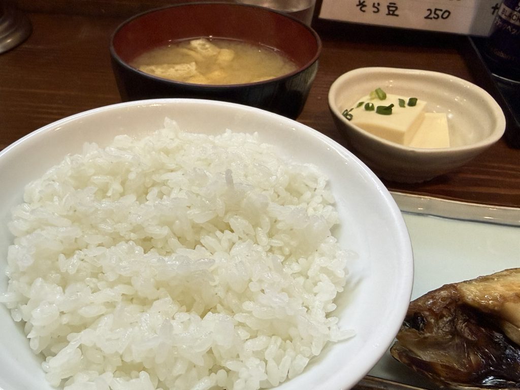 定食セットはご飯・味噌汁・小鉢のセットで、味噌汁は+60円で豚汁、+110円で貝汁にも変更できる。この日の小鉢は冷奴、お味噌汁の具材は油揚げ。